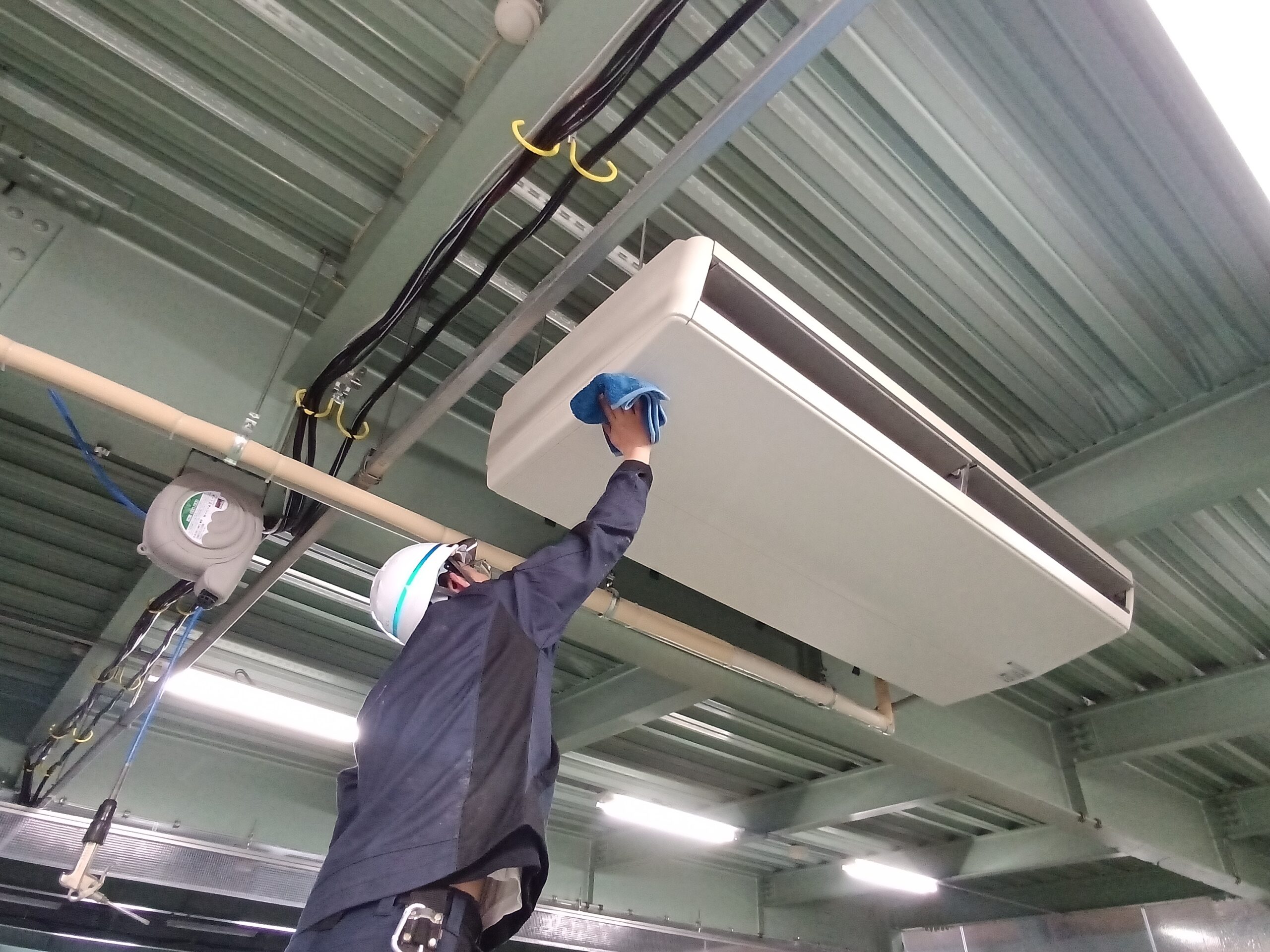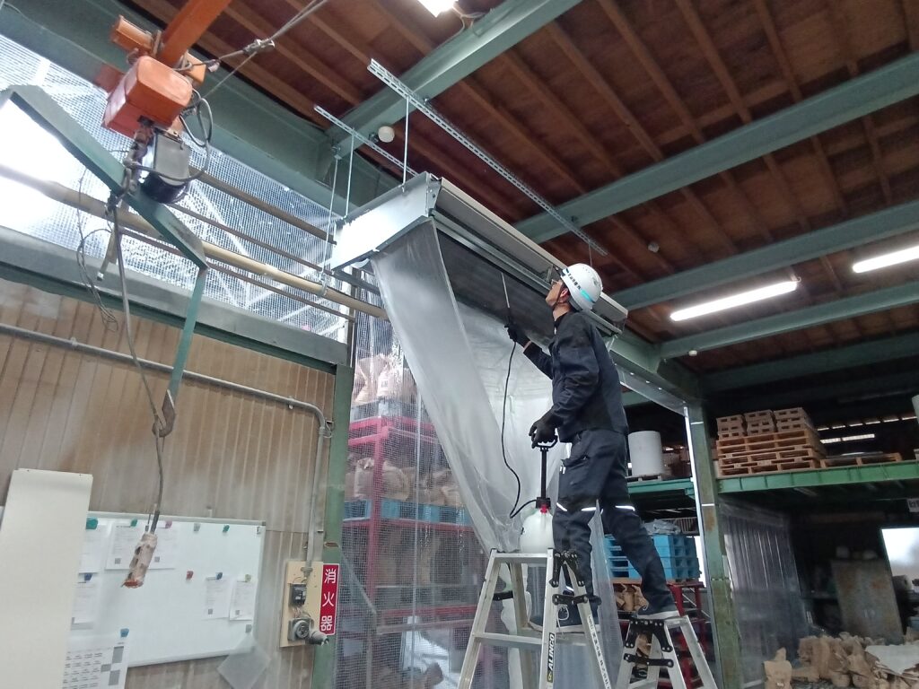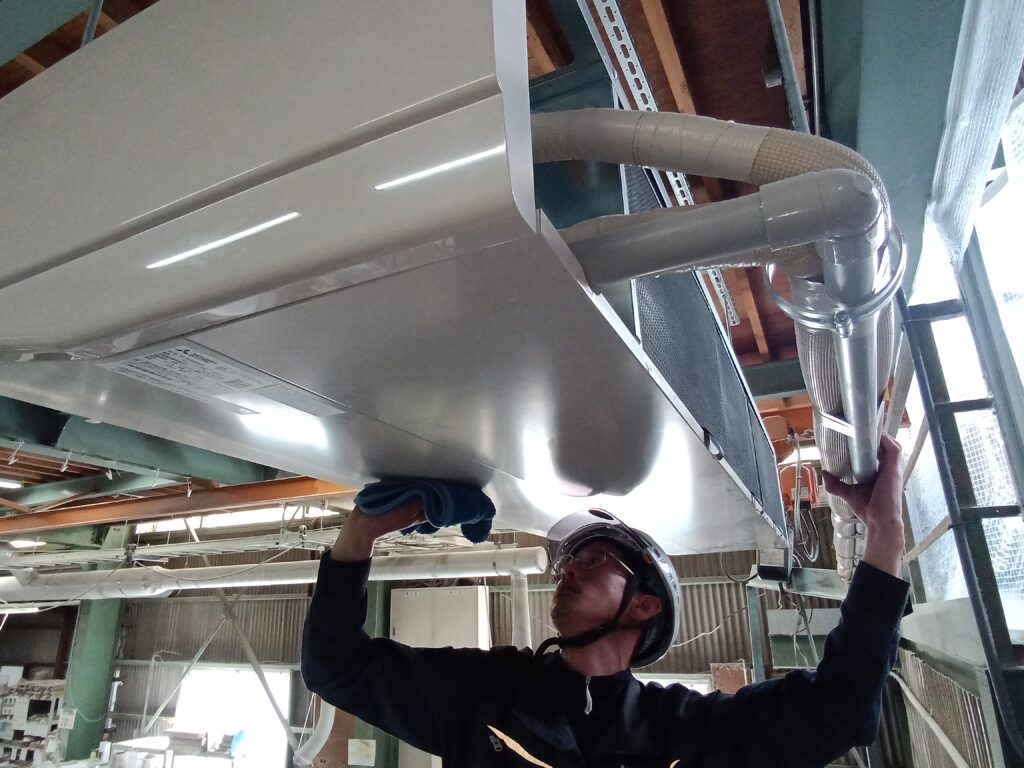 工事では、フィルター清掃に加え、ファンなどの内部部品についても専用洗浄剤および高圧洗浄を用いて徹底的に洗浄を実施しました。