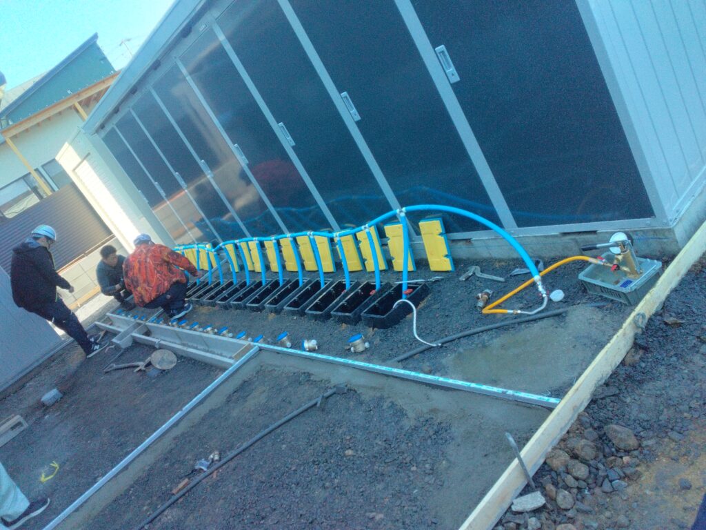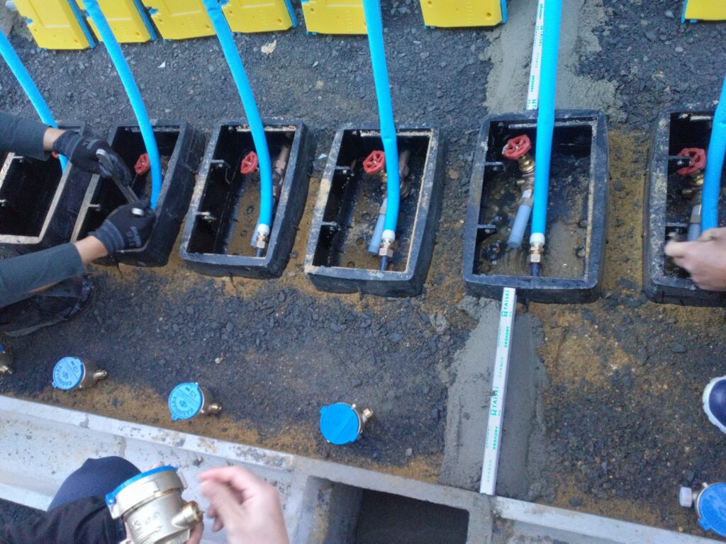 各部屋の水道の水が出るか?水道メーターが適切に取付けられており、計量が出来るか?等を検査するための大事な検査です。ここでちゃんとメーターが動かないとメーターに異常があったり、うまく配管の接続が出来ていないということになります。 市役所の方の立会いの下、全16戸の検査を行いました。